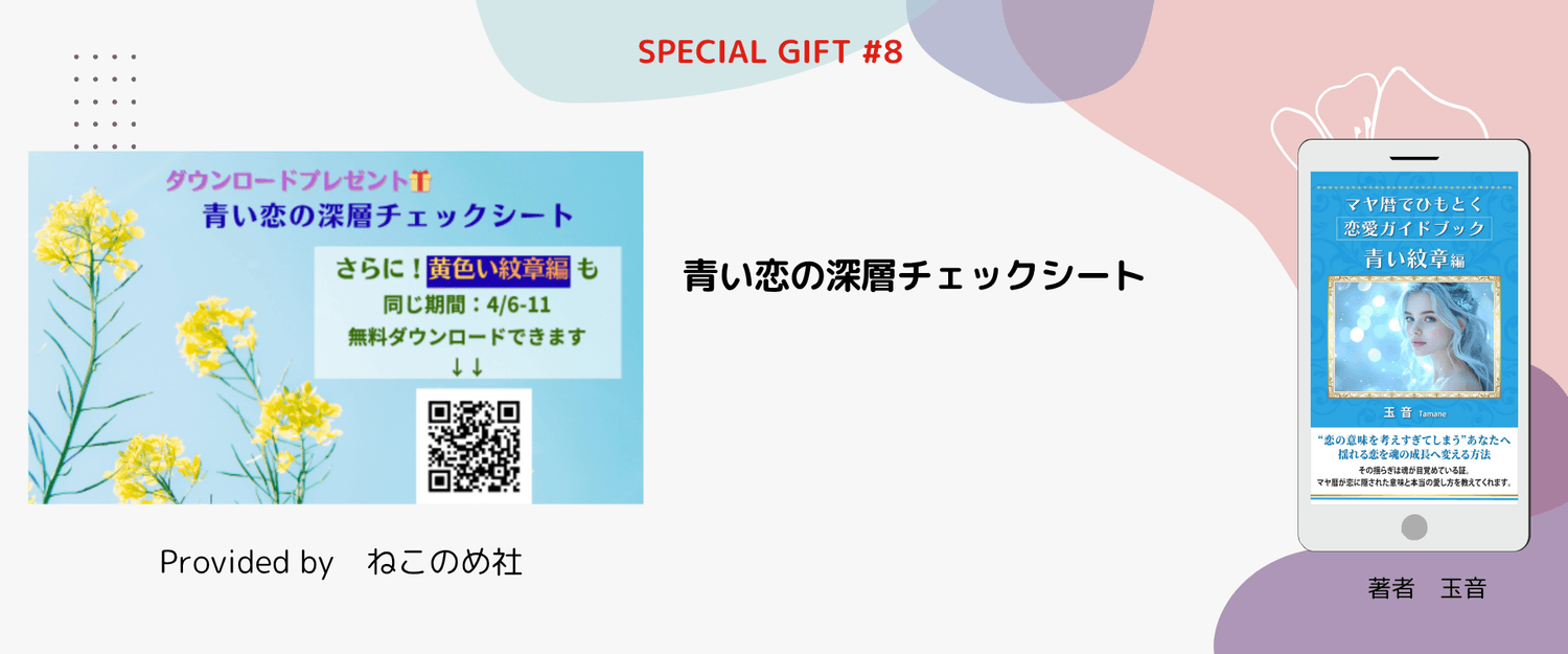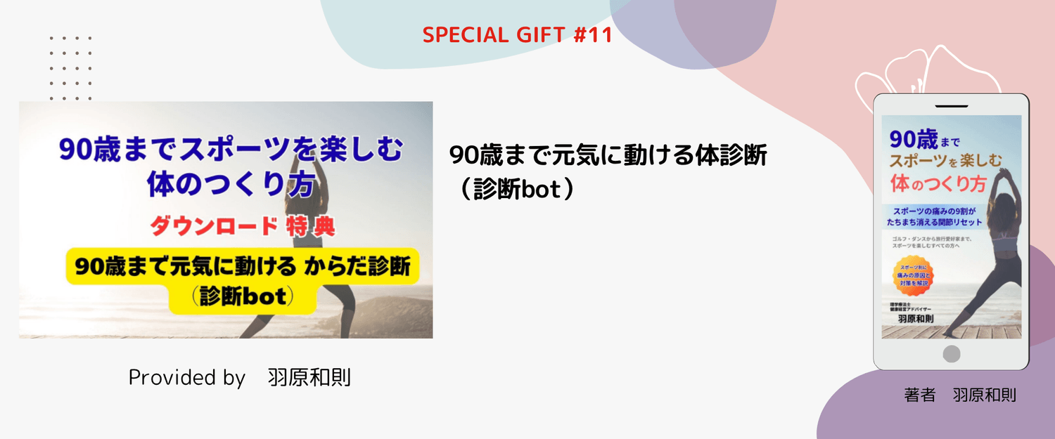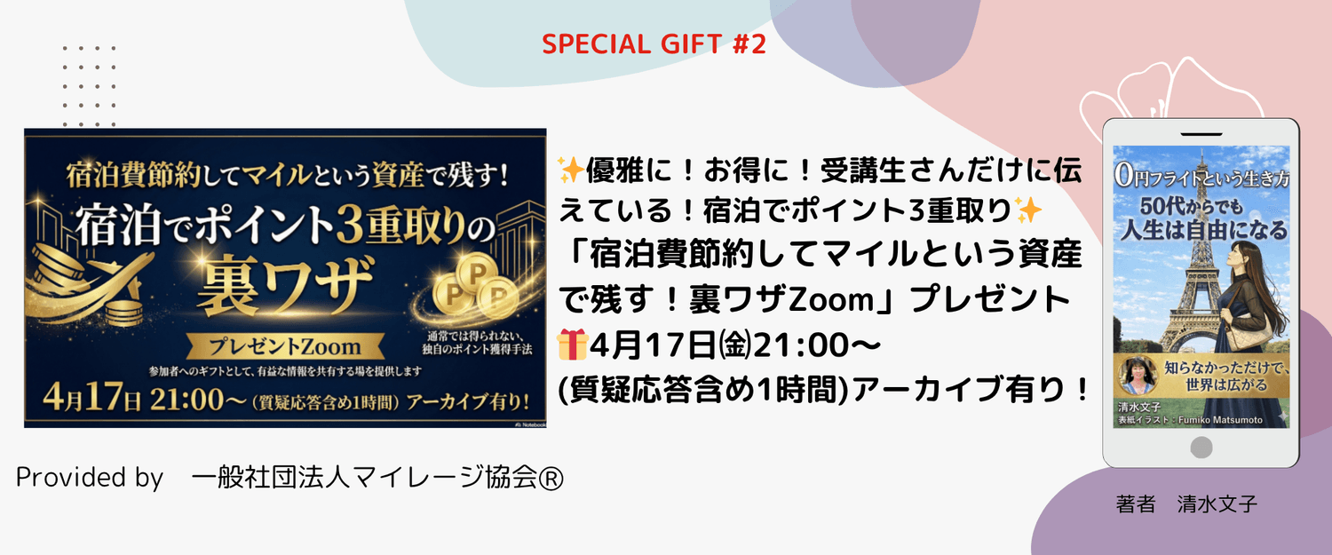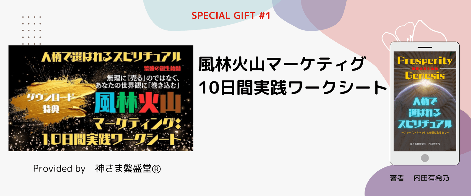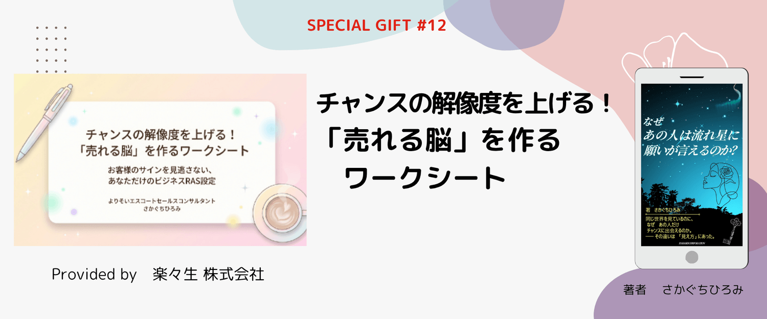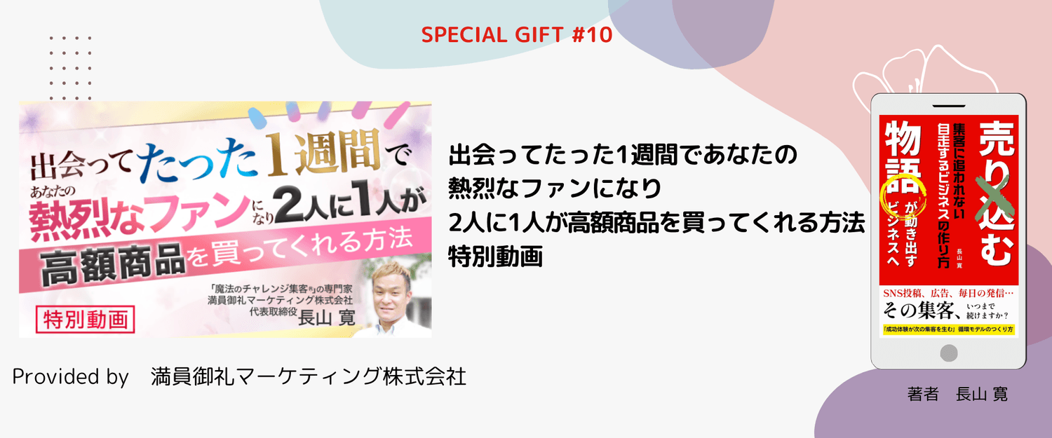 プレゼント提供者である「楽々生 株式会社」「神さま繁盛堂Ⓡ」「一般社団法人マイレージ協会Ⓡ」「ストーリー工房」「有限会社オフィスクリハラ」「ボディSINKA株式会社」「彩 ゆみ」「いえラボCOMPASS」「ねこのめ社」「合同会社RE」「満員御礼マーケティング株式会社」「羽原和則」に提供されます。